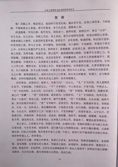 近日,山东工商学院人文与传播学院2024届编辑出版学20级02班本科毕业生候阳,在其毕业论文结尾“致谢”部分用文言文谢授业之恩、谢同窗之谊、谢养育之情,洋洋洒洒千余字,用词文雅、表达恳切,尽显文字功底和文化底蕴,一众网友惊呼为“毕业论文致谢天花板”。