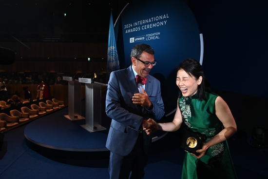 5月28日,在位于法国巴黎的联合国教科文组织总部,中国科学家颜宁(右)出席“世界杰出女科学家奖”颁奖典礼。