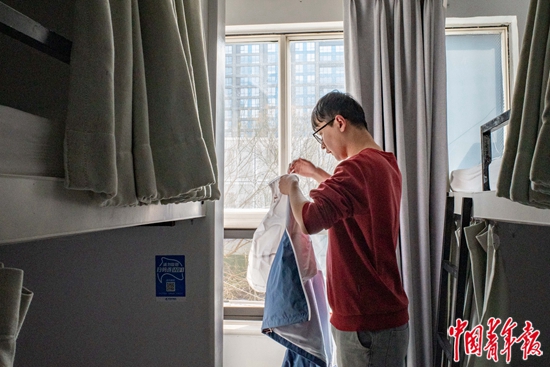 4月3日,北京市海淀区一家青旅内,车辆工程专业学生贺泽宇正在房间内取外套,准备去实验室。贺泽宇今年大四,从山东大学保研至清华大学。由于有提前进课题组的需要,他和同年级的几位同学一起订了这家青旅3个月的床位。