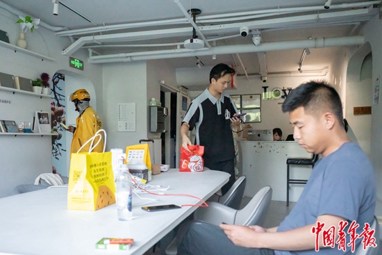 5月27日,北京市海淀区一家青旅内,一位住客取走桌子上的外卖。在这里,外卖统一由外卖员放到大厅桌子上,住客自行认领。