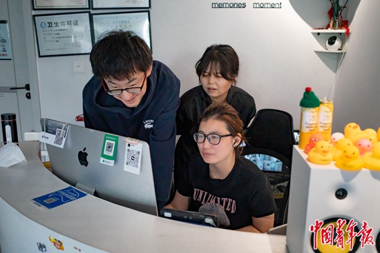 5月27日,北京市海淀区一家青旅内,许博添(左一)正在帮前台处理账单。作为入住近两年的老住客,许博添见证过很多次前台人员流动,所有工作人员都认识他,偶尔也会请他帮忙。