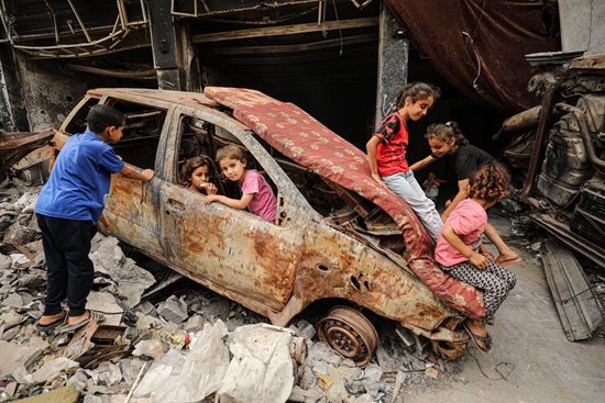 5月28日,加沙城,孩子们在被炸废墟上的一台破车上玩耍。视觉中国供图