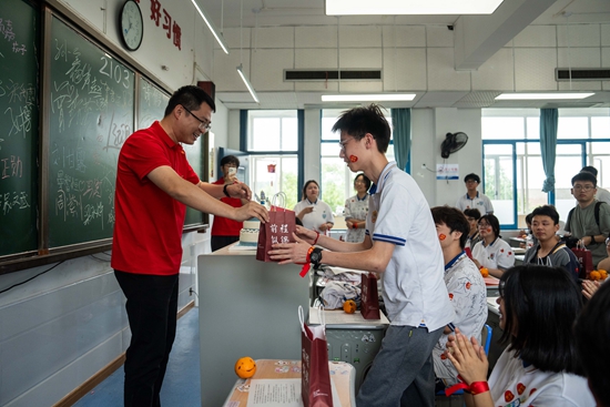 6月6日,在长沙市同升湖高级中学,老师(左一)为考生发放考前礼包。