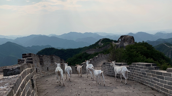 林孙诚随长城保护员巡查时遇见在长城上漫步的羊。受访者供图