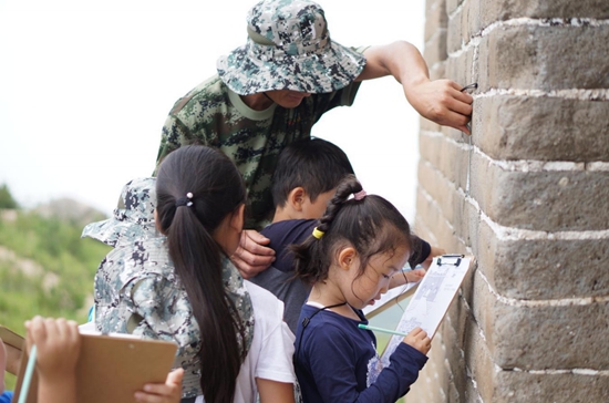 与刘红岩一起巡视这段长城时,林孙诚感到,与慕田峪长城或八达岭长城等“典型性长城”不同,石峡段长城保留着最原始的风貌。由于没有得到更好的保护,许多点段已开裂、坍塌,损毁严重;一些砖墙上还留有驴友、背包客乱涂乱画的痕迹。“这些痕迹已经无法清除,如果强行复原,会对墙体造成二次伤害。”林孙诚决定在设置课程时,要“把保护长城的种子种在孩子心里”。他在研学课程中设计了复原“砖墙”的体验课,让孩子们用清洗工具对乱刻乱画的砖头(非长城砖)进行清理,在这个过程中感受“做不到”的遗憾,从而让孩子建立遗产保护意识。