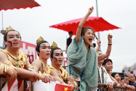 6月10日,洛邑古城足球队拉拉队在场边加油助威。
