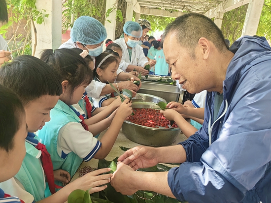 北京市大兴区魏善庄镇第二中心小学星光志愿服务队小志愿者,在老人指导下学习包粽子。北京市大兴区魏善庄镇第二中心小学供图