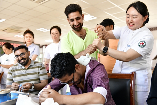 6月18日,青岛大学国际教育学院的留学生来到青岛西海岸新区中医医院,感受中医药文化的魅力。青岛西海岸新区中医医院依托特色科室资源优势,与青岛大学、山东科技大学和中国石油大学(华东)联合共建国际学生中医药文化体验基地。该基地成立6年来,共接待留学生600余人次。新华社记者 郭绪雷/摄