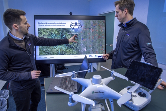 1月24日,中国无人机技术应用于德国农业领域,来自弗劳恩霍夫计算机图形研究所的菲利普·雷使用专业软件在显示器上分析农业用地的无人机图像,图上标记表明植物生长的变化。视觉中国供图