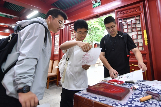 7月17日,在山东省青岛市民俗博物馆,三名高中生在体验拓印非遗木版年画。暑假期间,各地青少年来到山东省青岛市民俗博物馆,通过参观体验传统民俗文化,丰富假期生活。王海滨/摄(新华社发)