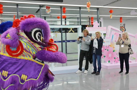 4月6日,搭载了2500余人的“迈希夫五号”邮轮抵达上海吴淞口国际邮轮港,游客陆续下船进入上海,开启为期两天的入境城市观光体验。图为邮轮港到达厅的舞狮表演吸引外国游客围观拍照。视觉中国供图