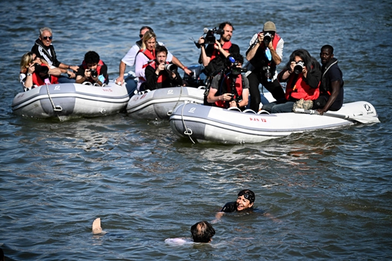 7月17日,法国巴黎,巴黎市长安妮·伊达尔戈(河中游泳者右一)在塞纳河游泳,以向外界证明塞纳河水质“足够干净”,可以确保巴黎奥运会水上项目正常举行。视觉中国供图