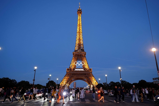 用奥运五环点缀的埃菲尔铁塔伫立在巴黎的夜色中。视觉中国供图