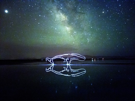 以夜为布,以光为笔。王思博从零开始摸索这种极致明暗、色彩交织、细节丰富的作品呈现形式,“每一点位置和速度的变化,都会影响图案、线条、光影的最终呈现。差之毫厘,失之千里,这需要大量的练习,也是个熟能生巧的过程。”他回忆,刚开始创作时,完成小鱼、小蟹这样的简单图案都需要四五十遍的磨合。