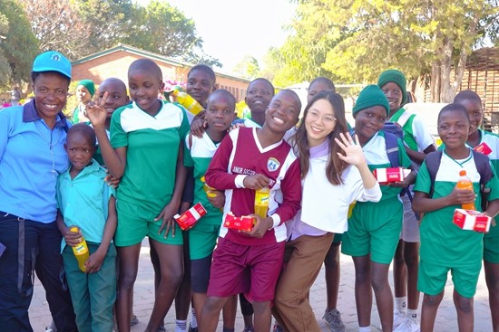 王欣钰(前排右一)在津巴布韦塔法拉第五小学与获得比赛胜利的女足队员合影。王欣钰供图
