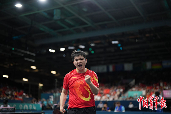 8月4日,法国南巴黎竞技场,巴黎奥运会乒乓球男单决赛,中国选手樊振东在赢球后庆祝。当日的比赛中,樊振东战胜瑞典选手莫雷高德,拿下奥运会乒乓球男单冠军。中青报·中青网记者 李隽辉/摄