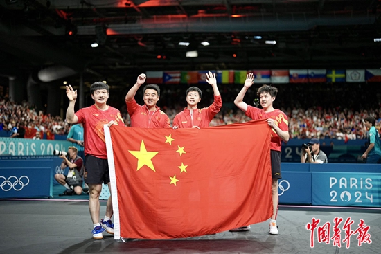 当地时间8月9日,法国巴黎,巴黎奥运会乒乓球男子团体决赛,樊振东(左一)、马龙(右二)、王楚钦(右一)夺冠后与教练王皓合影。当日,中国队在比赛中以3∶0力克瑞典队,获得金牌,实现奥运会该项目五连冠。中青报·中青网记者 李隽辉/摄