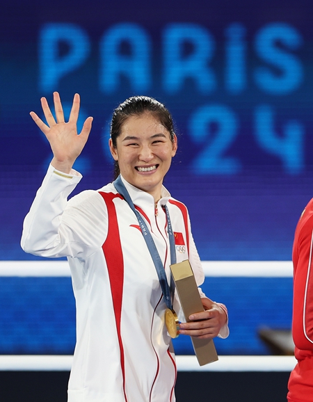 当地时间8月10日,中国选手李倩在颁奖仪式后。当日,在巴黎奥运会拳击项目女子75公斤级金牌赛中,李倩夺得金牌。新华社记者 任鹏飞/摄