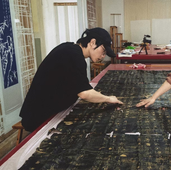 2024年的一天,俞明锐在修一幅六尺长的碑帖。受访者供图