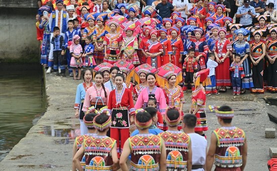 8月18日,在柳州市融水苗族自治县汪洞乡,村民们在改造后的河道上对唱山歌。近年来,广西柳州市融水苗族自治县汪洞乡在结对帮扶的广东省廉江市相关部门的支持下,充分利用水资源丰富的优势,举办水上竞技比赛、山歌对唱活动、非遗文化进校园等,擦亮“水文化”品牌,推进民族文化旅游产业发展,助力乡村振兴。新华社记者 黄孝邦/摄