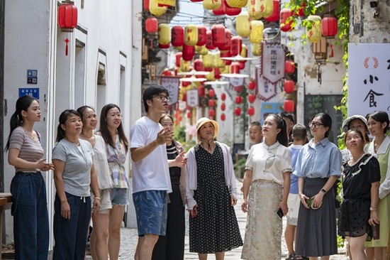8月18日,浙江省金华市金东区岭下镇坡阳古街里,村民和游客学习党的二十届三中全会精神。当天,金华市“五学五讲五示范·全会精神青年说”新声代骨干基层巡回宣讲金东场活动在此举行,青年宣讲员结合各自工作实践,为村民和游客宣讲党的二十届三中全会精神。胡肖飞/视觉中国