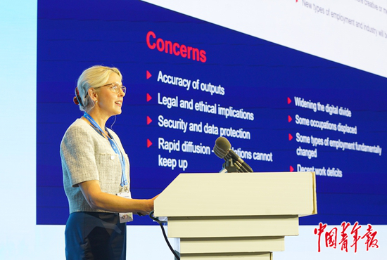 8月15日,重庆,2024年世界青年发展论坛数字发展主题论坛,国际劳工组织亚太技能和就业能力专家玛丽·肯特以《生成式人工智能与职场未来》为题发表主旨演讲。中青报·中青网记者 李峥苨/摄