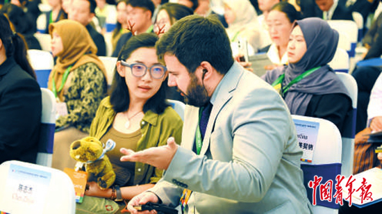 8月14日,2024年世界青年发展论坛绿色发展主题论坛暨中国-东盟青年发展论坛上,两位与会代表进行交流。中青报·中青网记者 谢洋/摄
