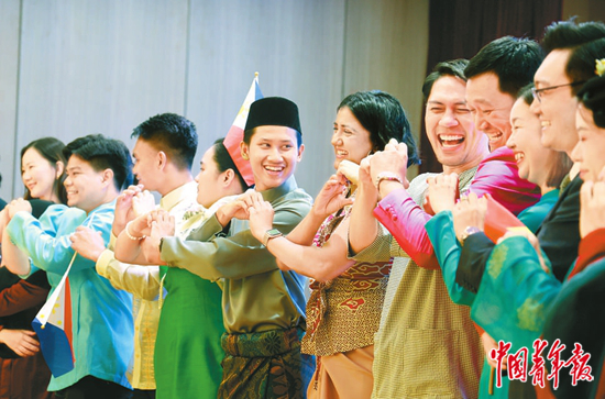 8月16日晚,广西南宁,第15届中国—东盟青年营举行的欢送会上,各国青年手挽手比心。中青报·中青网记者 谢洋/摄