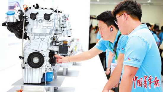 8月15日,广西柳州,来自老挝的田若文(后)和刘银能专注地打量上汽通用五菱自主研发的高效混动专用发动机。中青报·中青网记者 谢洋/摄