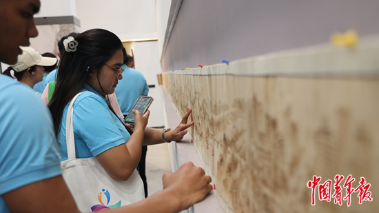 8月15日,广西柳州,青年代表被柳州市第二职业技术学校创作的68米烙画长卷《百里柳江》深深吸引。中青报·中青网记者 谢洋/摄