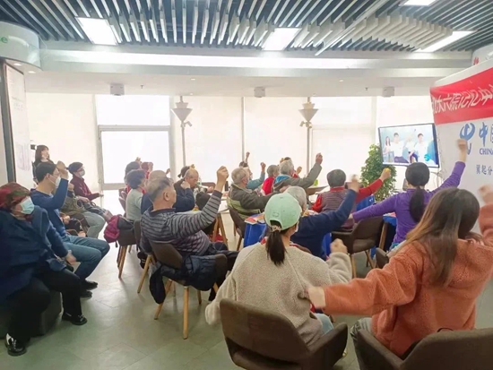 联谊会上,患者和家属跟着志愿者做乐动益智操。