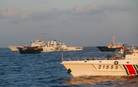 3月23日,菲律宾派出两艘海警船、1艘运补船擅闯中国仁爱礁邻近海域,图谋向其非法“坐滩”军舰运送违规建筑材料。中国海警依法依规实施规制、拦阻、驱离。视觉中国供图
