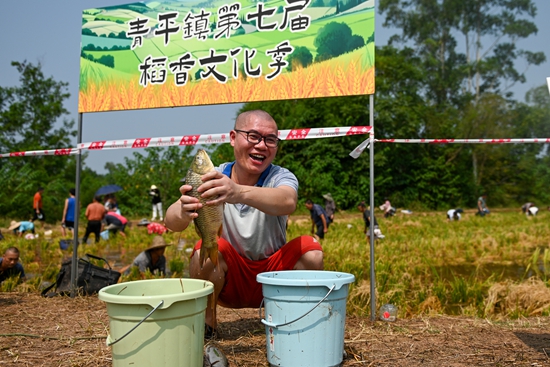 8月24日,四川乐山,2024年中国农民丰收节庆祝活动暨青平镇第七届稻香文化季活动启幕现场,收割谷子农技比赛、稻田捉鱼等有趣的农耕活动吸引了40组家庭、120人参与。图为男子展示自己在稻田捉到的一条大鱼。视觉中国供图(中新社记者 刘忠俊/摄)