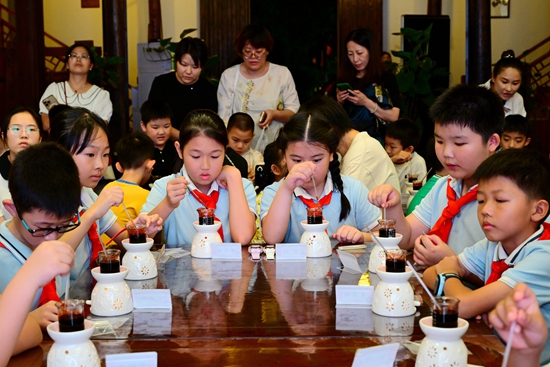 8月20日晚,位于浙江金华古子城的婺州中医药文化馆内药香袅袅、热闹非凡,来自当地38个亲子家庭的孩子正在参加“小小中药童”暑期实践活动,参观体验传统中医药文化、实践古法紫草膏制作。 据悉,该活动由金华市中医医院举办,是金华市卫生健康委“传承国粹,启智润心”——开展中医药文化进校园系列活动之一。今年暑期以来,该系列活动已举办了10多场,吸引了市区各小学数百亲子家庭参与,同学们直观、具象地了解了中医药文化,充分感受中医药文化魅力,提升中医药健康素养,自觉延续传承中华文化基因。视觉中国供图