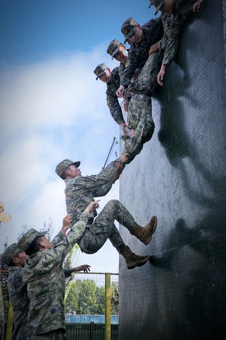 近日,国防科技大学开展2024年研究生军政融合教育,图为研究生学员正在进行协同超越课目训练,协力翻越4米高墙。国防科技大学 苏建国/摄