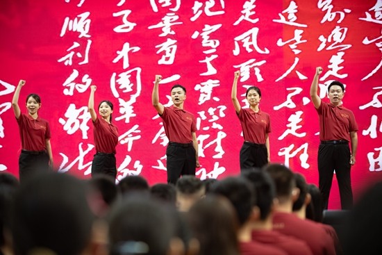 8月26日,中国人民大学2024级本科新生开学典礼上,中国人民大学“延河讲师团”的同学们现场朗诵《我们从延安走来》。中国人民大学供图