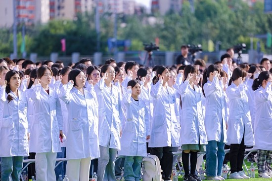8月28日,首都医科大学举行2024级新生开学典礼,新生们在国旗下齐诵医学生誓词。首都医科大学供图