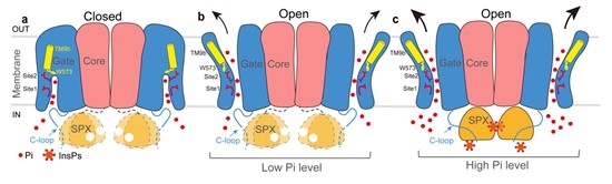 XPR1蛋白非常“聪明”,为了避免过多磷酸根离子的外排导致营养流失,会利用自己末端一段柔性络环控制通道开口的大小。而SPX结构域可以通过感受细胞内磷酸肌醇的浓度来调控XPR1外排磷酸根离子的通量。