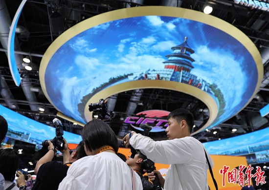 9月11日,北京,国家会议中心,记者在2024年中国国际服务贸易交易会综合展上拍摄采访。