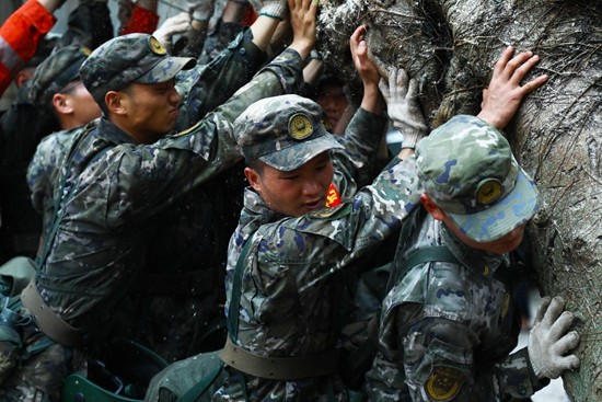 9月7日,武警海南总队官兵扶起倒伏的树干。于阳/摄