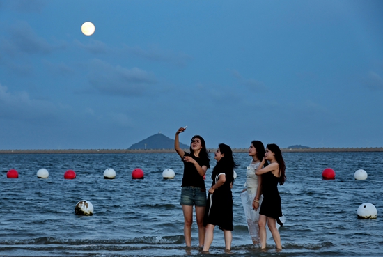 9月17日,在上海金山城市沙滩,人们在月下留影。中秋假期,人们走出家门,乐享多彩假日。庄毅/摄(新华社发)