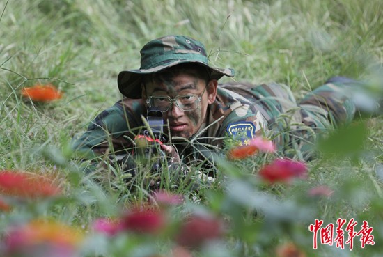 9月16日,北京化工大学昌平校区,在新生军训行军拉练途中,由蓝色特战队扮演的“敌军”提前按战术安排设伏于丛林中,模拟伏击战情形。中青报·中青网记者 陈剑/摄