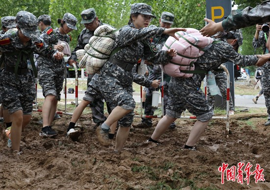 9月16日,北京化工大学昌平校区,新生在军训行军拉练中过“沼泽地”。中青报·中青网记者 陈剑/摄