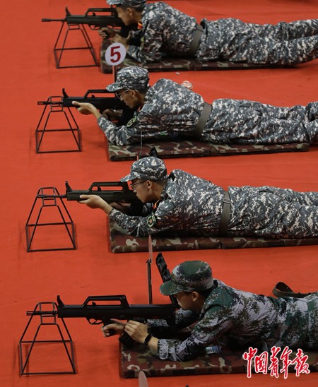 9月15日,北京化工大学昌平校区,学生在体育馆进行仿真枪射击训练。中青报·中青网记者 陈剑/摄