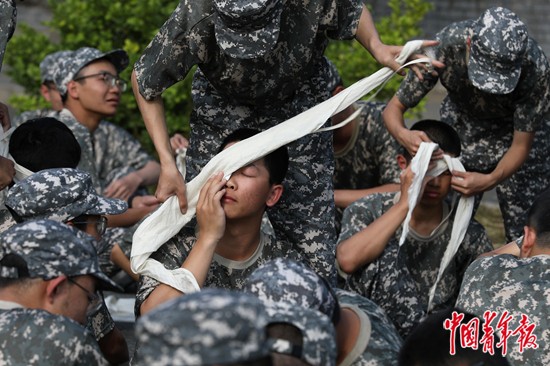 9月15日,北京化工大学昌平校区,男生们进行战场医疗救护的头部包扎和止血练习。中青报·中青网记者 陈剑/摄