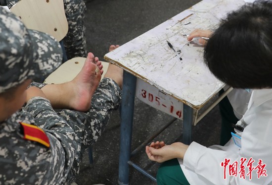 9月15日,北京化工大学昌平校区,军训医疗保障点,校医院的医生为一名脚底被磨破皮的同学检查伤情,交代治疗的注意事项。中青报·中青网记者 陈剑/摄