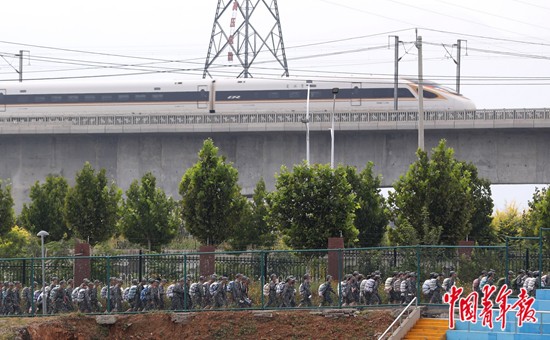 9月16日,位于北京市昌平区南口附近的北京化工大学昌平校区,新入学的大学生们穿着迷彩服、背着背包排成4列长长的队伍,走在学校的大路上,一列“复兴号”动车组列车从不远处的京张高铁高架桥上驶过。这是该校新生军训正在进行的行军拉练,同学们要负重行军17公里,历时5个多小时。
