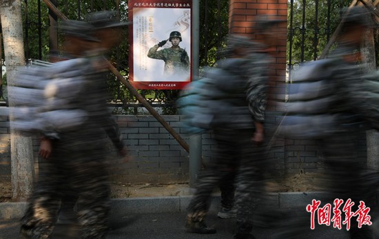 9月16日,北京化工大学昌平校区,行军拉练队伍从一处该校优秀退伍大学生士兵的宣传画前经过。中青报·中青网记者 陈剑/摄