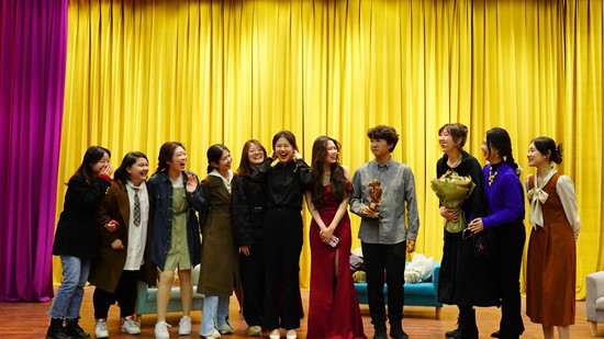南开大学翔宇剧社康曦月(中)随《禁闭》剧组在演出后谢幕。受访者供图