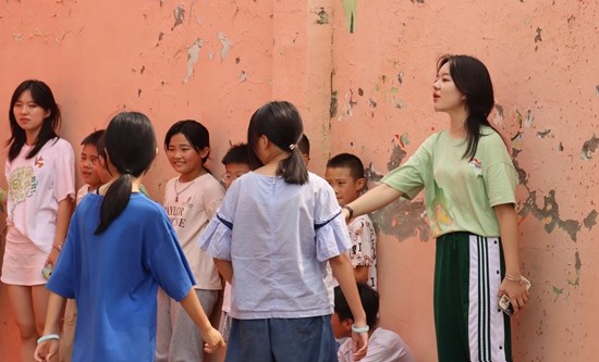 中国传媒大学三农学社的李孟熹(右一)与乡村小学生做游戏。受访者供图